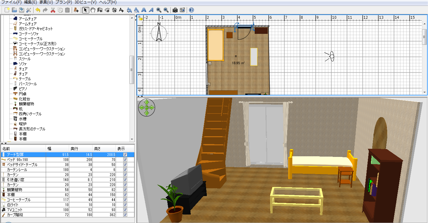操作は部屋の間取り(実際の大きさ)を設定し、その中に家具を置いていくだけ。本物の家作成に特化したソフトなだけあって、大きさがわからなくなることもありません。